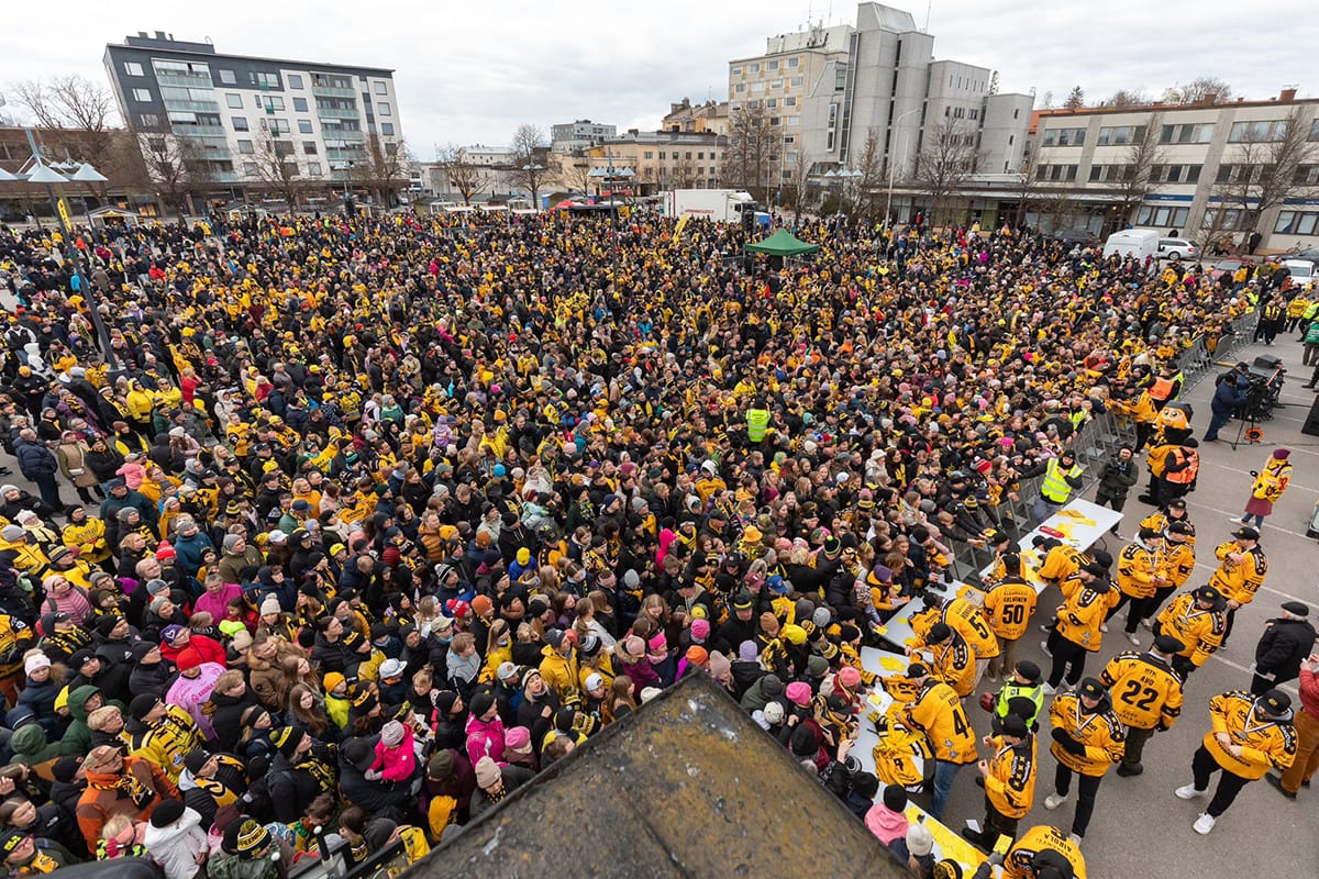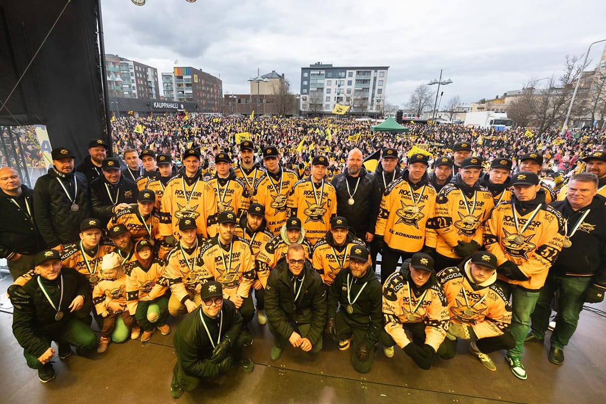 SM-hopeamitalistit palkittiin mitalein, pelaajien lisäksi valmentajat ja huoltojoukot. Eetu sai mitalinsa palkintojen jaossa jäähallissa ja oli mukana mitalijuhlissa torilla.